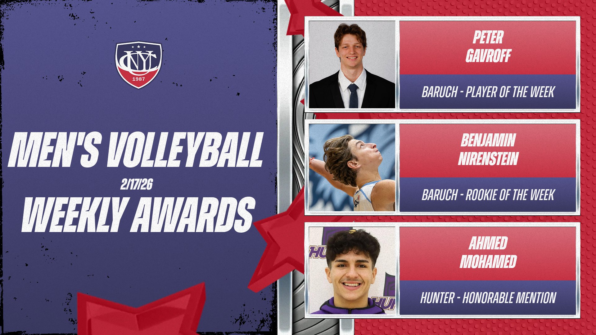 The #13-ranked Baruch College Bearcats stormed back after dropping the first two sets to win the 2012 CUNY Athletic Conference / Con Edison Men's Volleyball Championship, defeating their host, the #11 Hunter College Hawks in five sets, 23-25, 22-25, 25-20, 25-18, 15-10.